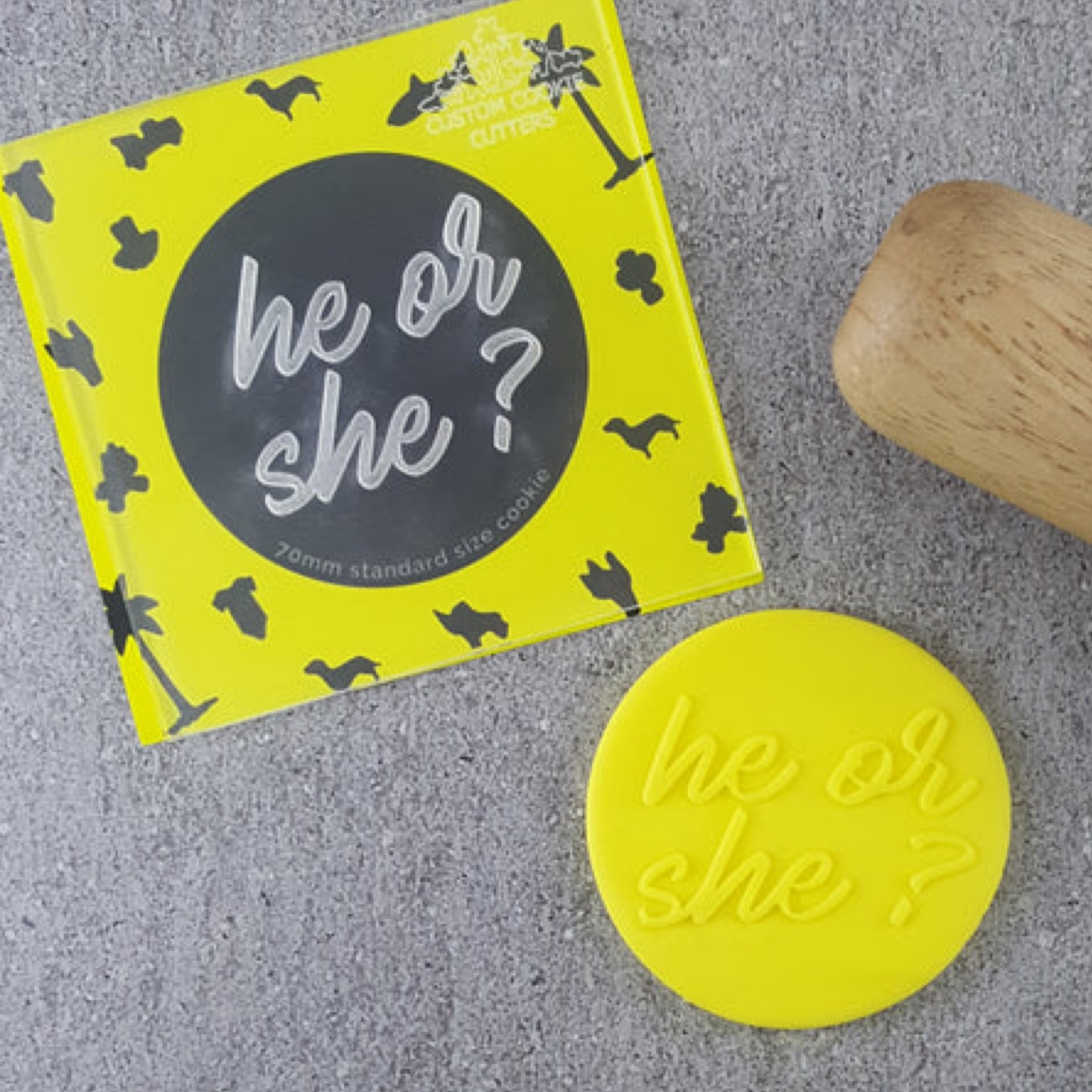 OLD – Custom Cookie Cutter Debosser – Raised he or she 70 mm DEB 320